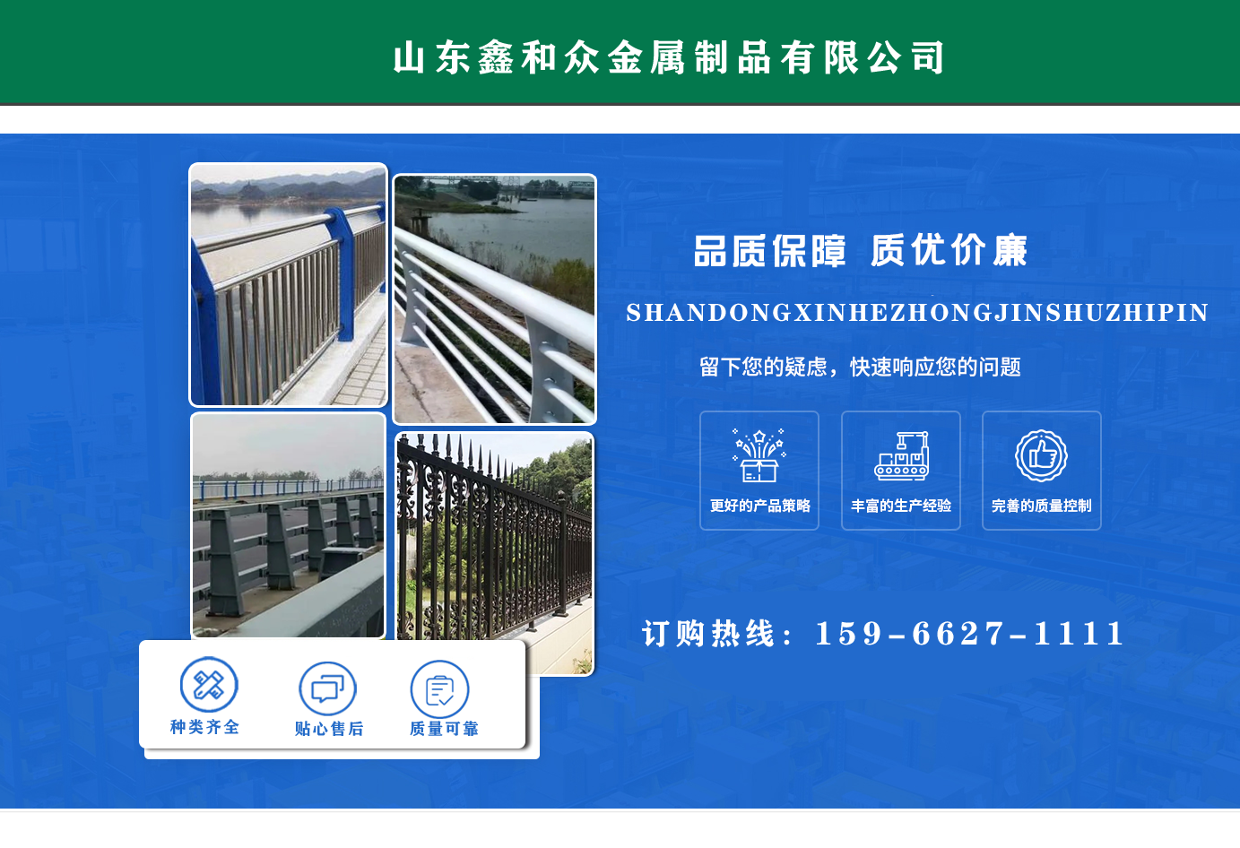 山東鑫和眾金屬制品有限公司主要產(chǎn)品有防撞護(hù)欄,橋梁護(hù)欄,道路護(hù)欄,河道護(hù)欄,不銹鋼護(hù)欄等護(hù)欄。提供設(shè)計方案,一站式定制,包您滿意價格優(yōu)惠,歡迎來電咨詢! 公司常年從事銷售護(hù)欄防撞護(hù)欄,橋梁護(hù)欄,道路護(hù)欄,河道護(hù)欄,不銹鋼護(hù)欄,橋梁鋼護(hù)欄,河道燈光護(hù)欄等。產(chǎn)品廣泛應(yīng)用于橋梁、河道、旅游景區(qū)、道路、公路、公園、小區(qū)、景觀、道路防撞等領(lǐng)域。 公司產(chǎn)品均采用優(yōu)質(zhì)不銹鋼材料,符合相關(guān)標(biāo)準(zhǔn)。各種型號不銹鋼復(fù)合管及護(hù)欄,質(zhì)量嚴(yán)格把控。產(chǎn)品強度高、耐腐蝕、焊接牢固、抗沖擊、性能好,防撞護(hù)欄結(jié)構(gòu)簡單、美觀實用大方。 歡迎前來訂購!...